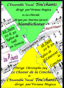 « Tous les Évènements Cet évènement est passé Concert Recital du choeur de la Conche et de l’ensemble Vocal Tou’Chant 18 juin 2022 @ 20 h 30 min - 23 h 00 min « Bal des Semences avec HK à Violay Salon Artimuse à Feurs » + Google Agenda+ Exporter vers iCal Détails Date : 18 juin 2022 Heure : 20 h 30 min - 23 h 00 min Catégorie d’Évènement: Concert Lieu Eglise de St laurent de la Conche