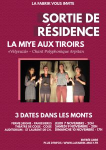 La Miye Aux Tiroirs était en résidence à St Symphorien sur Coise du 24 au 27 Octobre, et vous pourrez découvrir le résultat de ce travail les 7, 9 et 10 Novembre à Panissières, Coise et St Laurent de Chamousset